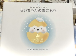 ・「らいちゃんの雪ごもり」は雷鳥のヒナ?が卵の中から飛び立つ手前をモチーフにした焼菓子。北海道や信州地方でその姿を確認されている。 |