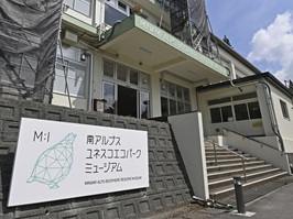 ・「雷鳥クッキー」はミュージアムの2階にあるカフェレストランでジェラードなどスイーツの上に鎮座する形で提供される。またレストランではシカやイノシシを使ったワンプレートやジビエバーガー、井川産茶葉を使用した茶そば、雑穀入りのサンドイッチなど南アルプス産原材料を使ったメニューが味わえる。 |