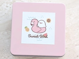 ・2025年「夏のインコクッキー缶」に鳥類ではオカメインコ/ビキニ・セキセイブルー/スイカ・白文鳥/うきわの3種が詰められている。 |