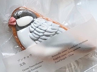 ・広いジャンルのデザインを手がけるアイシングクッキー専門工房で作られた文鳥型のアイシングクッキー。