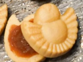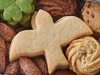 ・クッキーの形は「ふくら雀」。日本では福を呼ぶ縁起物として扱われ、「福来雀」「福良雀」とも表記される。 |