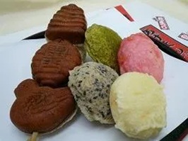 ・「あげ人形焼き」は五重塔・提灯・鳩の3種類の人形焼きを串刺しにして揚げたもの。裏メニューに「シナモン味」がある。 |