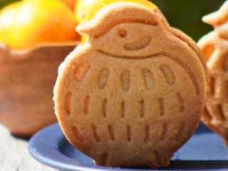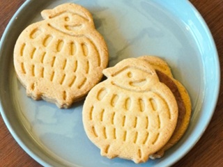・クッキーの形は「ふくら雀」。日本では福を呼ぶ縁起物として扱われ、「福来雀」「福良雀」とも表記される。 |